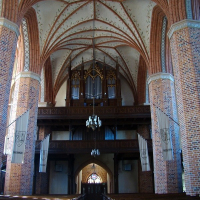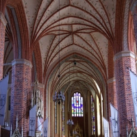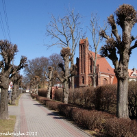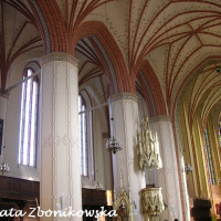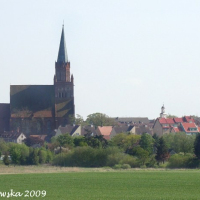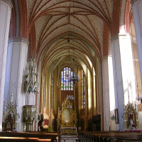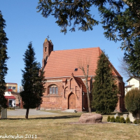Kościół parafialny p.w. Macierzyństwa NMP XIV/XV w., gotycki, halowy o trzech nawach, podzielonych filarami wspierającymi gwieździste sklepienia. Z nawy wyrasta
